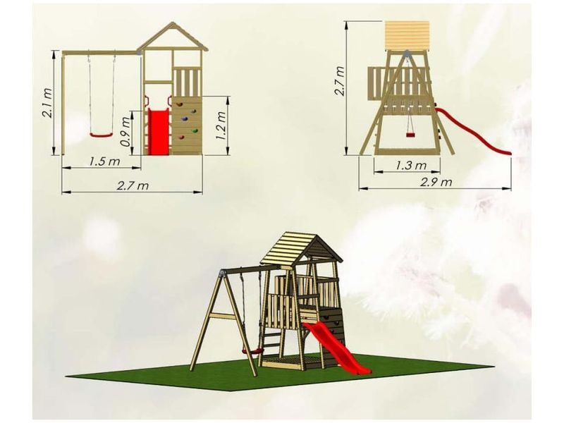Der Spielturm mit den Maßen 290×270×270 cm ist eine praktische und unterhaltsame Ergänzung für Ihren Garten. Zum Turm gehören eine Rutsche, eine Schaukel und eine Kletterwand, die Kindern vielfältige Spielmöglichkeiten bieten. Er ist ein idealer Ort für Abenteuer und kreative Spiele, die Ihre Kinder begeistern und lange beschäftigen.