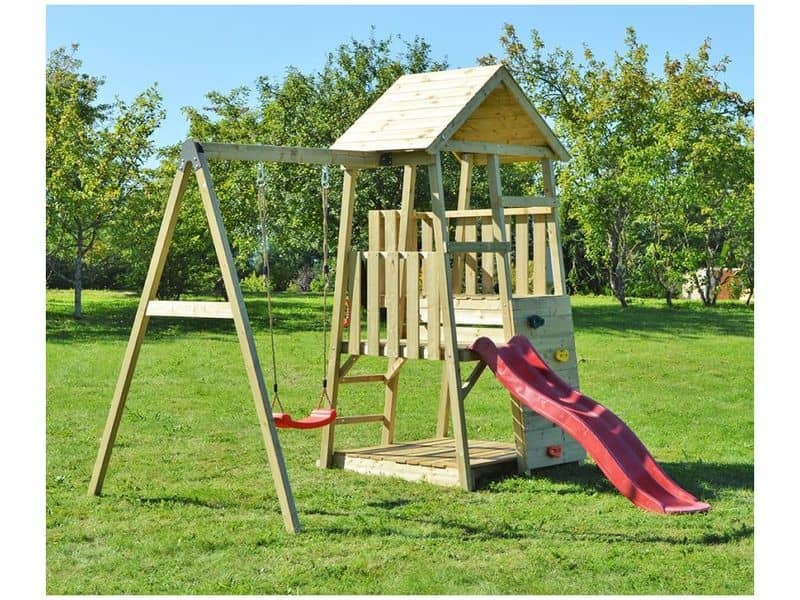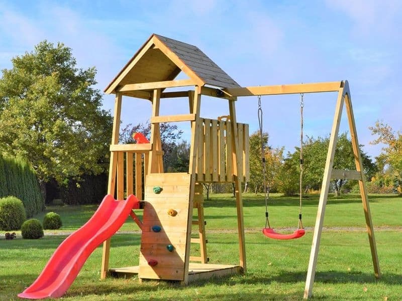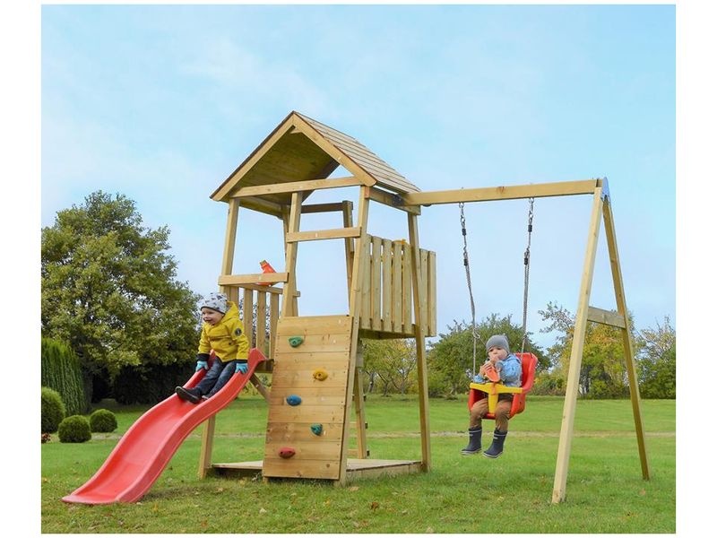 Der Spielturm ist mit einer Rutsche ausgestattet, die sowohl über eine Leiter als auch über eine Kletterwand erreichbar ist. Ihr Kind kann sich im Häuschen ein geheimes Versteck einrichten oder sich in verschiedene kreative Spiele vertiefen. Darüber hinaus sorgt die Schaukel für zusätzlichen Spielspaß.