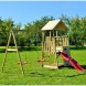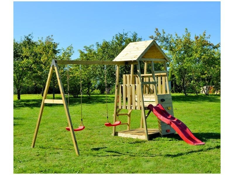 Der Spielturm ist mit einer Rutsche ausgestattet, die sowohl über eine Leiter als auch über eine Kletterwand erreichbar ist. Ihr Kind kann sich im Turm ein geheimes Versteck einrichten oder sich in verschiedene kreative Spiele vertiefen. Außerdem sorgt die Schaukel für zusätzlichen Spielspaß. Unter dem Turm befindet sich ein Sandkasten.