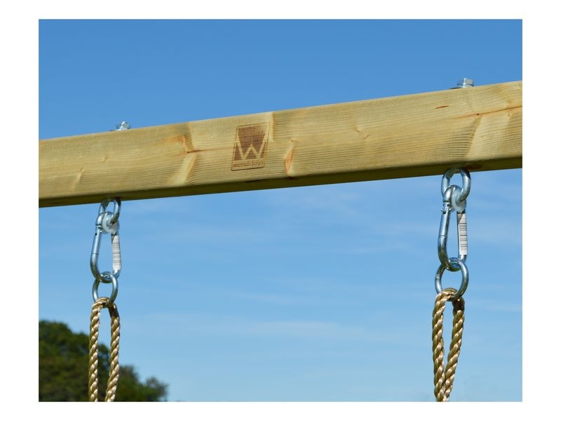 Der Spielturm ist aus widerstandsfähigem nordischem Kiefernholz gefertigt, das eine lange Lebensdauer und Sicherheit für Ihre Kinder gewährleistet. Alle verwendeten Materialien erfüllen strenge Sicherheitsstandards, bestätigt durch das FSC-Mix-70%-Zertifikat und die EN71-Norm. Die Tragfähigkeit des Turms beträgt 100 kg, die Schaukel ist bis 50 kg belastbar.