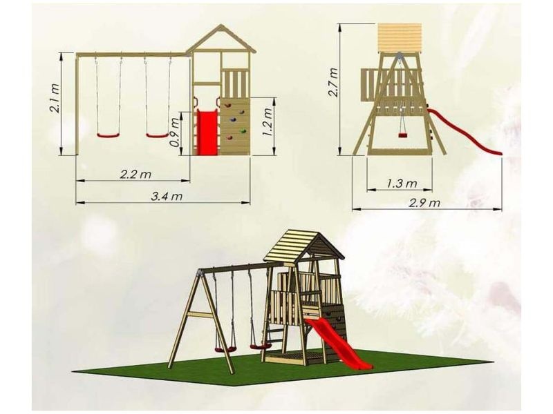 Der Spielturm mit den Maßen 290×340×270 cm ist eine praktische und unterhaltsame Ergänzung für Ihren Garten. Zum Turm gehören eine Rutsche mit Schaukeln, eine Kletterwand und ein Sandkasten, die Kindern vielfältige Spielmöglichkeiten bieten. Er ist ein idealer Ort für Abenteuer und kreative Spiele, die Ihre Kinder begeistern und lange beschäftigen.