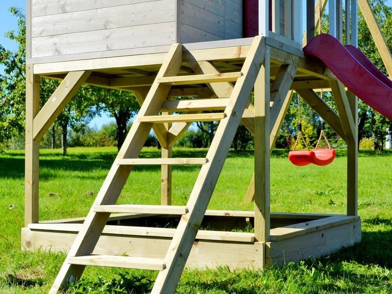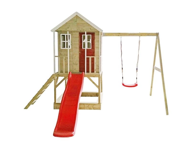 Das Haus ist mit einer Rutsche ausgestattet, die über eine Leiter erreichbar ist, sowie einem überdachten Sandkasten, der endlose Spielmöglichkeiten bietet. Der Sandkasten wird durch das Haus vor leichtem Regen geschützt, sodass Kinder auch bei weniger gutem Wetter spielen können. Im Inneren des Stelzenhauses können sich die Kleinen eine geheime Höhle einrichten oder sich an kreativen Spielen beteiligen.