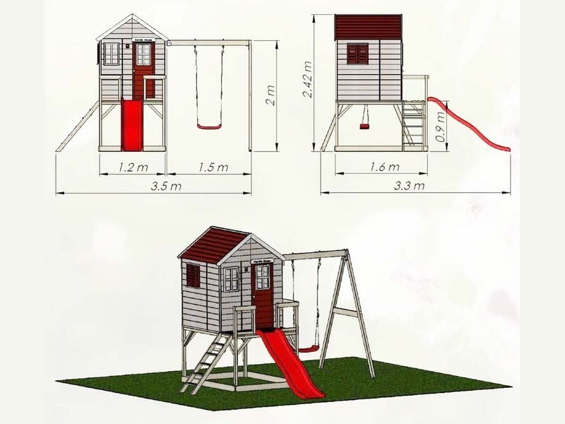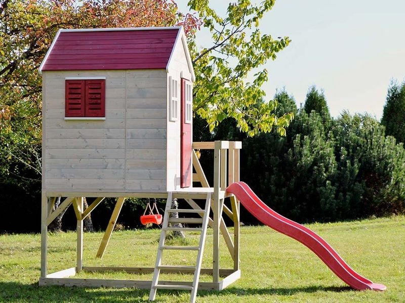 Ausgestattet mit einer Rutsche, die über eine Leiter erreichbar ist, und einem überdachten Sandkasten, bietet das Stelzenhaus unendliche Möglichkeiten für Spiel und Spaß. Der Sandkasten ist durch das Haus geschützt, sodass er auch bei leichtem Regen genutzt werden kann. Kinder können im Haus eine geheime Höhle einrichten oder sich in fantasievollen Spielen verlieren.