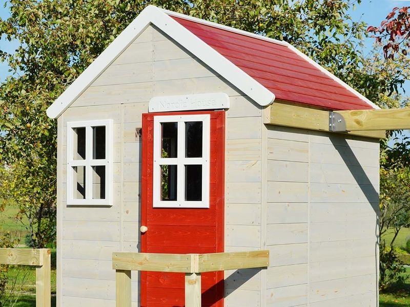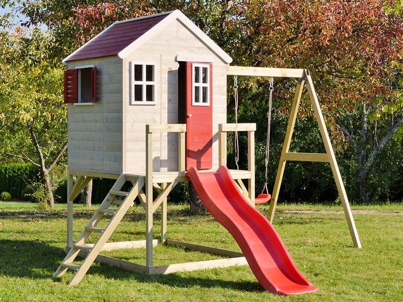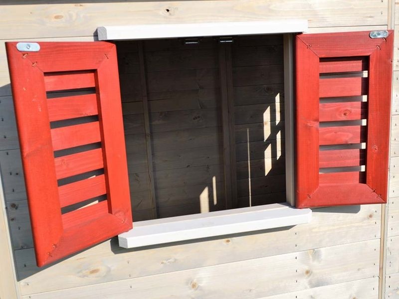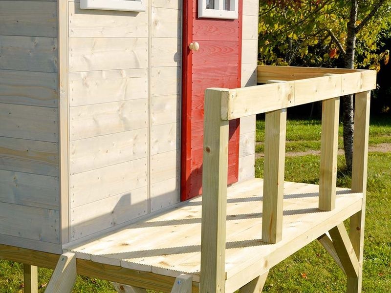 Das Kinderspielhaus auf Stelzen beeindruckt mit seinem natĂĽrlichen Look, der sowohl Kinder als auch Erwachsene anspricht. Zwei kleine Fenster aus Plexiglas und eine Veranda mit roten EingangstĂĽren machen das Haus nicht nur funktional, sondern auch optisch ansprechend und zu einem Hingucker in Ihrem Garten.