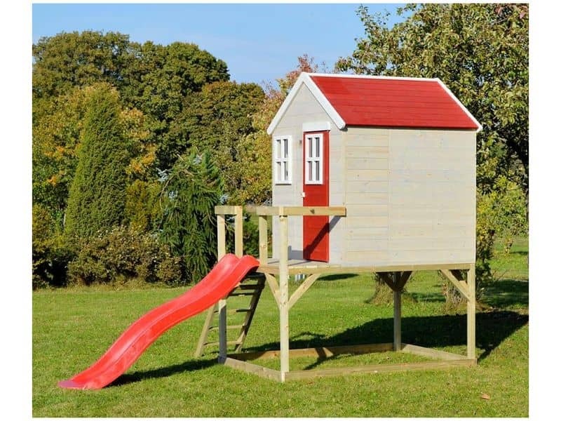 Das Stelzenhaus besticht durch seine natĂĽrliche Optik, die sowohl Kinder als auch Erwachsene anspricht. Mit zwei kleinen Plexiglasfenstern und einer Veranda mit roter EingangstĂĽr ist dieses Haus nicht nur funktional, sondern auch ein echter Blickfang.